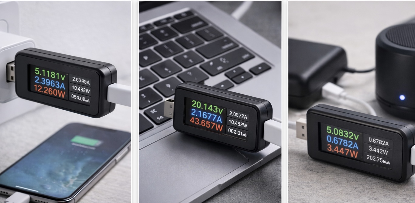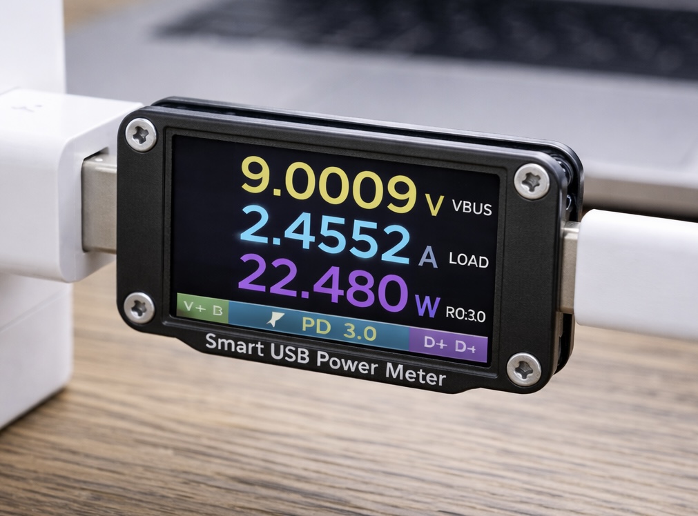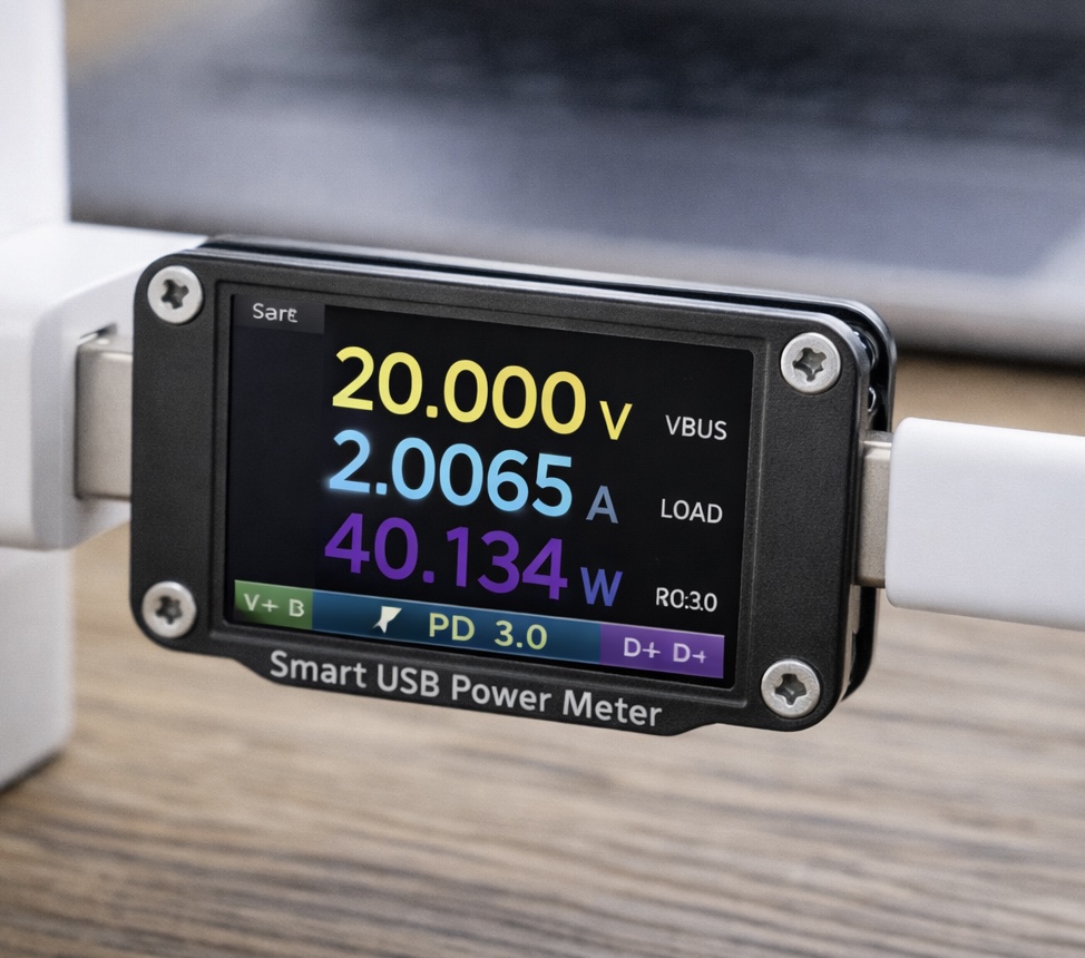 A compact USB power meter that accurately measures voltage, current, power, and energy usage in real time. Ideal for monitoring chargers, cables, power banks, and USB devices to ensure safe, efficient charging and troubleshoot power issues quickly.